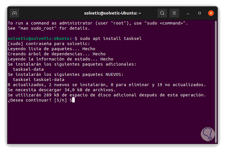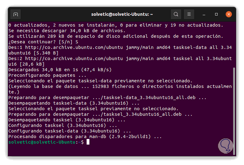 Abrimos la terminal en Ubuntu 22.04 e instalamos el gestor de paquetes Tasksel: