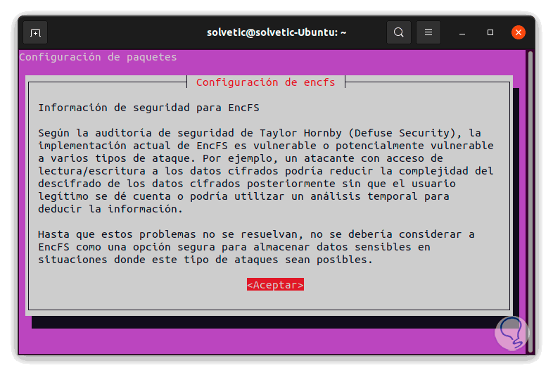 En primer lugar veremos lo siguiente. Este es un tema de seguridad EncFS, seleccionamos Aceptar.
