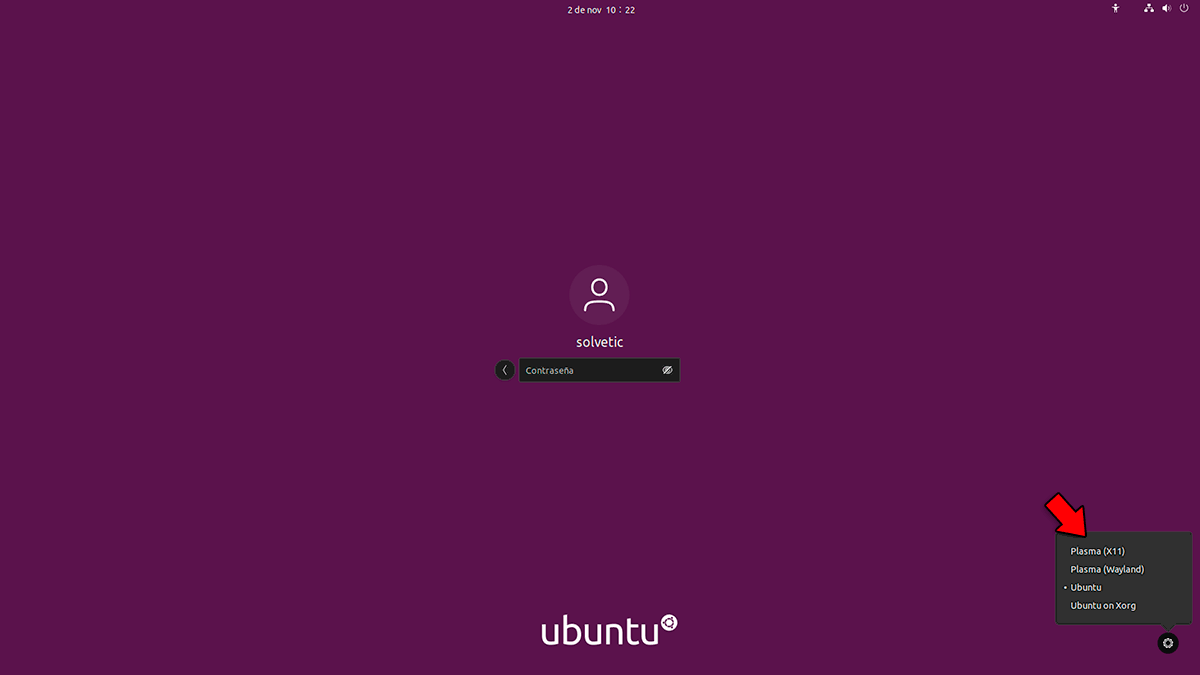 Podemos elegir Plasma Wayland o Plasma X11, luego iniciamos sesión. Veremos Ubuntu 22.04 en KDE Plasma: