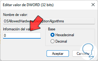 Establecemos el nombre "OSAllowedHardwareEncryptionAlgorithms":