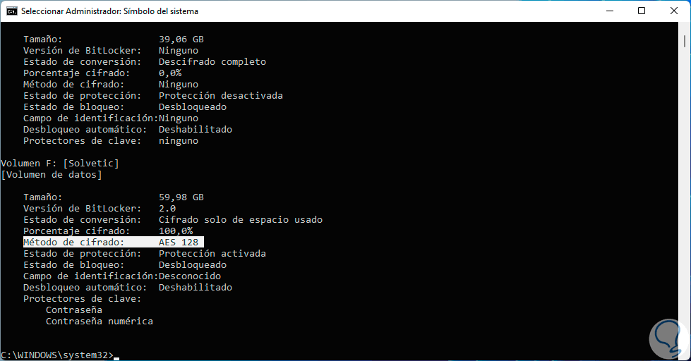 En la línea "Método de cifrado" validamos el estado de BitLocker y su método de protección.