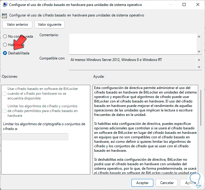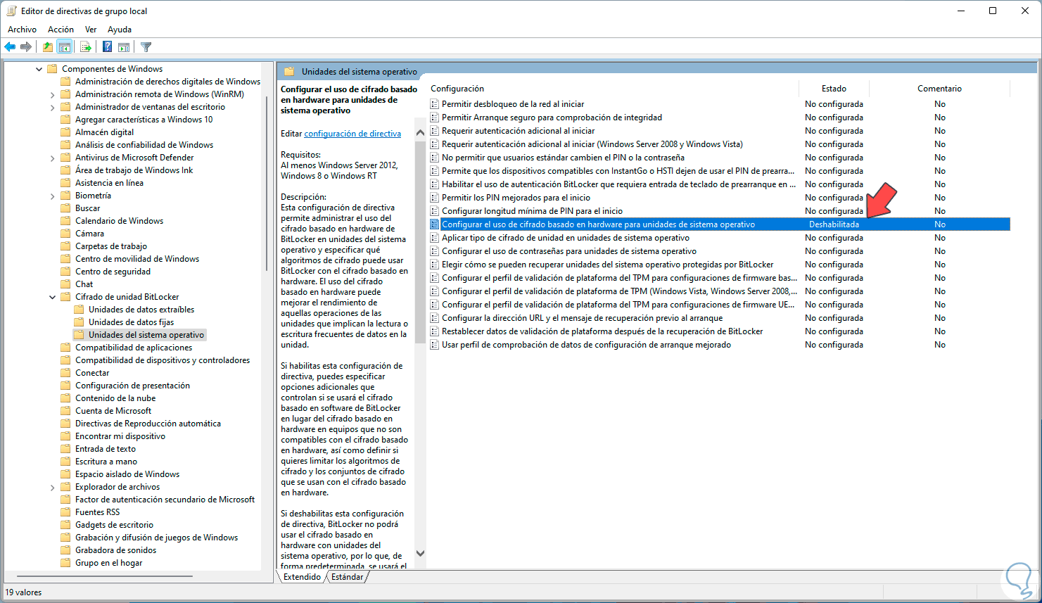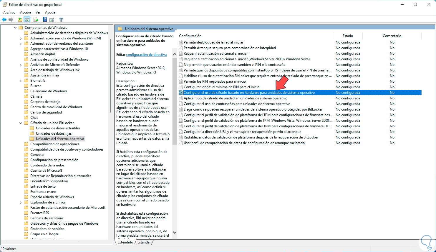 Allí ubicamos la política "Configurar el uso de cifrado basado en hardware para unidades de sistema operativo":