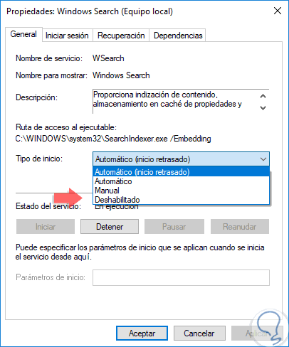 De entre las opciones seleccionaremos la opción de “Detener” para parar este servicio.