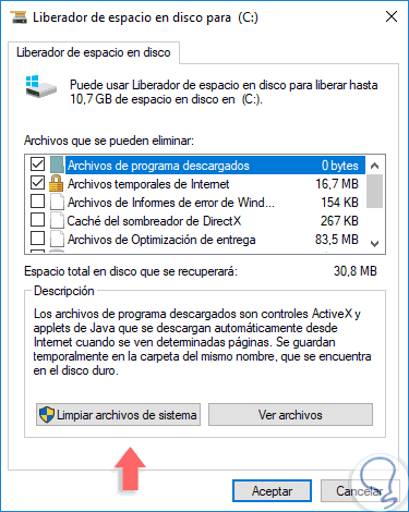Allí pulsamos en el botón “Liberar espacio” y luego del análisis veremos qué elementos pueden ser eliminados y el espacio que estos ocupan en el disco. Allí pulsamos en Aceptar una vez hayamos seleccionado los elementos deseados.