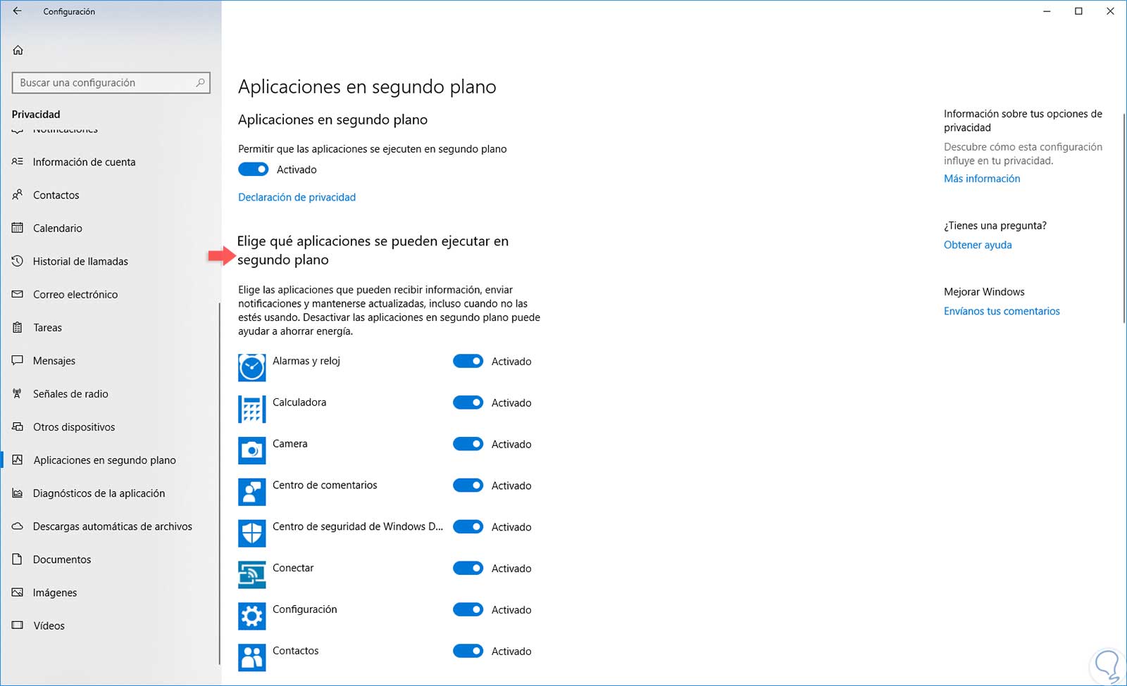 Allí pulsamos en la sección Privacidad y nos dirigimos a la sección “Aplicaciones en segundo plano”. Allí podremos desactivar las aplicaciones en segundo plano pulsando sobre su interruptor.