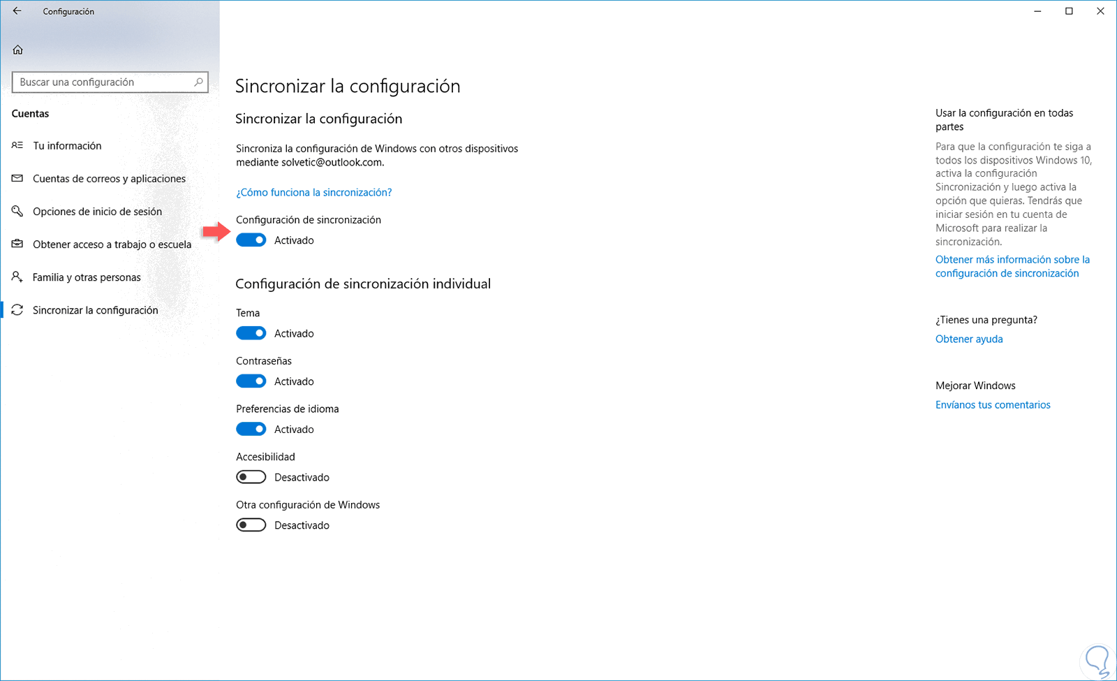 Allí debemos pulsar sobre el interruptor “Configuración de sincronización” para que su estado pase a ser deshabilitado.