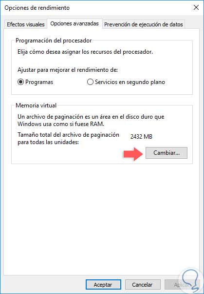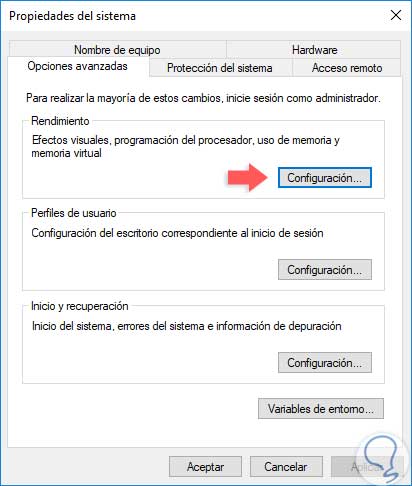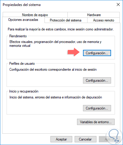 Daremos clic en el botón “Configuración” ubicado en el campo “Rendimiento” y en la nueva ventana iremos a la pestaña “Opciones avanzadas”: