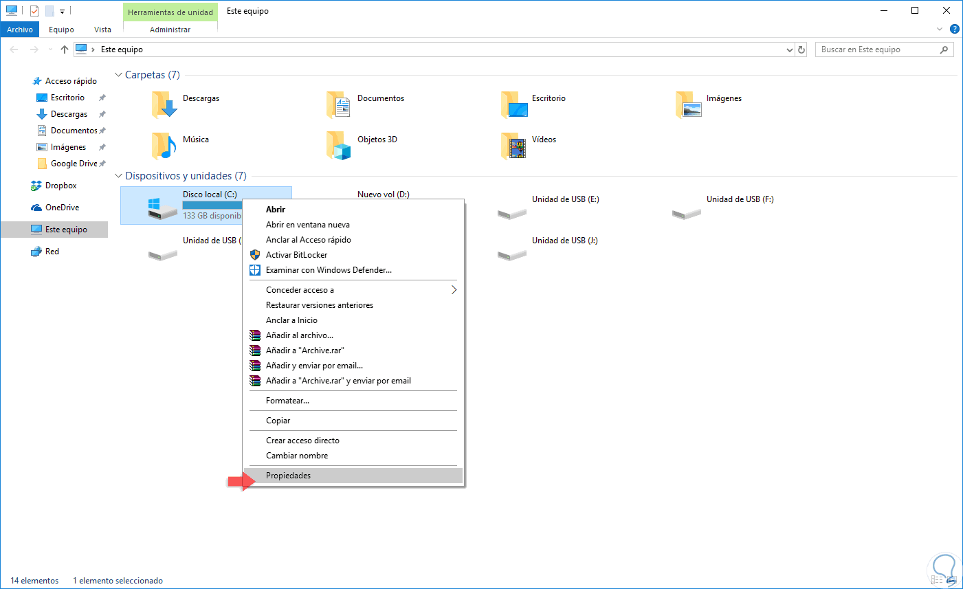 Windows 10 incluye una utilidad para ejecutar una tarea de limpieza en el disco duro a la cual podemos acceder dando clic derecho sobre la unidad y seleccionando la opción Propiedades: