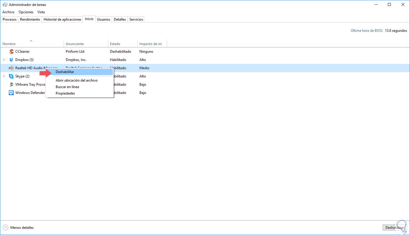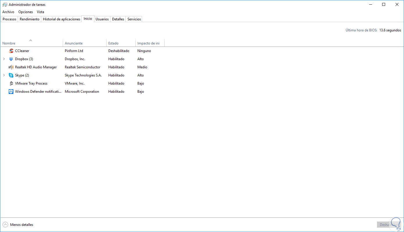 Allí vemos el estado actual de cada una de ellas y el impacto que esta tiene en el arranque de Windows 10. Si deseamos deshabilitar alguna de ellas contamos con dos opciones: