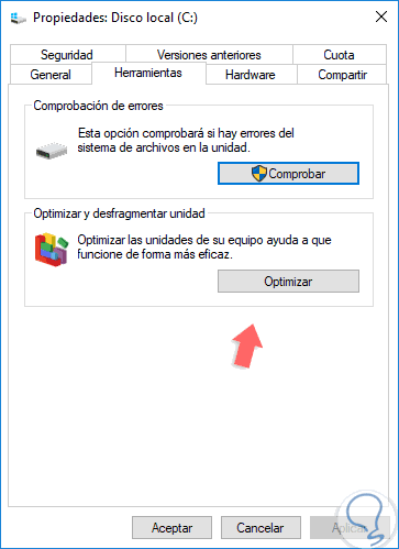 Para optimizar nuestro disco duro con este proceso, vamos de nuevo a las propiedades del disco y esta vez nos dirigimos a la pestaña “Herramientas” donde seleccionaremos la opción “Optimizar” ubicada en la sección “Optimizar y desfragmentar unidad”:
