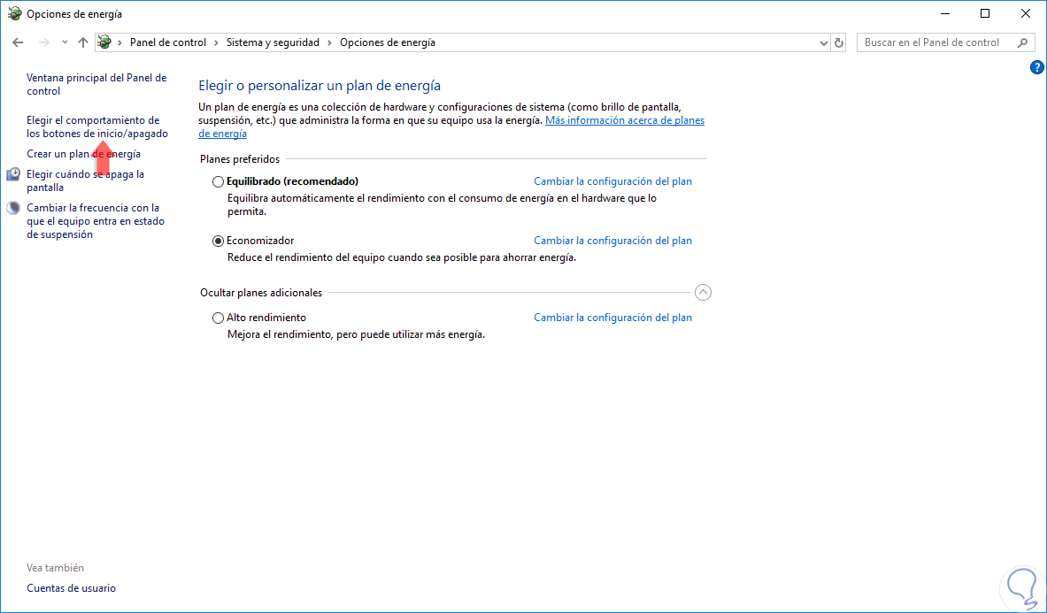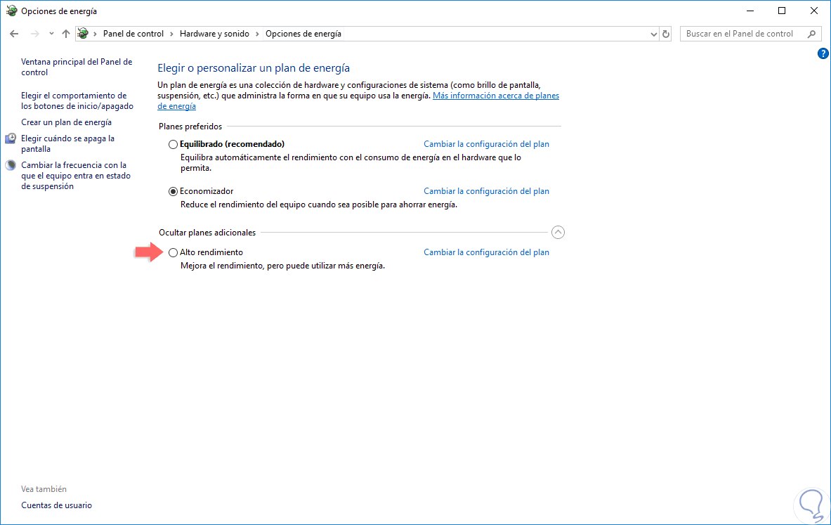 Allí podremos activar la casilla “Alto rendimiento” y de este modo este será el nuevo plan de energía de Windows 10.