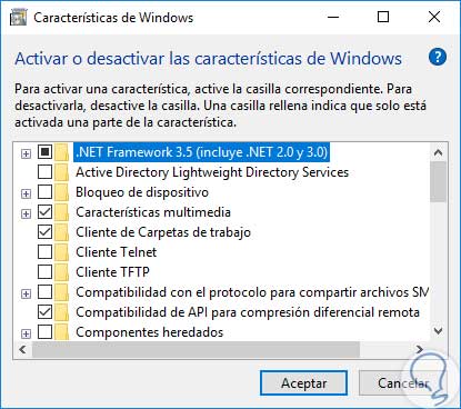 Allí daremos clic en la opción “Activar o desactivar las características de Windows” en el panel izquierdo y será desplegada la siguiente ventana donde seleccionaremos la característica a remover y la desmarcamos. Pulsamos en Aceptar para aplicar los cambios.