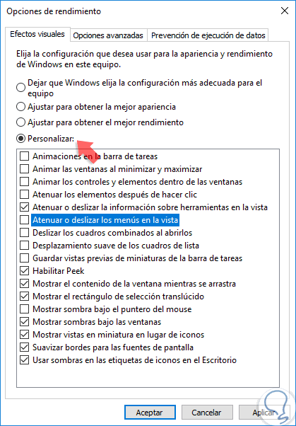 Pulsamos en el botón “Configuración” ubicado en la sección “Rendimiento” y en la nueva ventana desplegada activamos la casilla “Personalizar” y desmarcaremos las casillas que consideremos necesarias. Pulsamos en Aplicar y Aceptar para guardar los cambios.