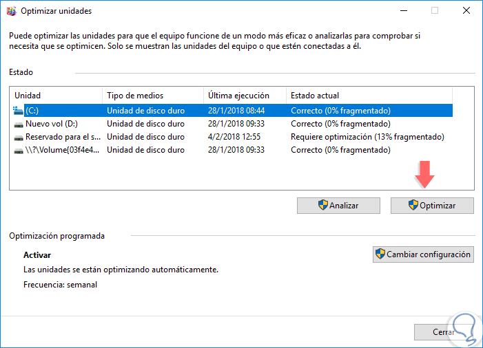 Allí veremos lo siguiente. Seleccionamos el disco a trabajar y pulsamos en el botón “Optimizar” para su desfragmentación.