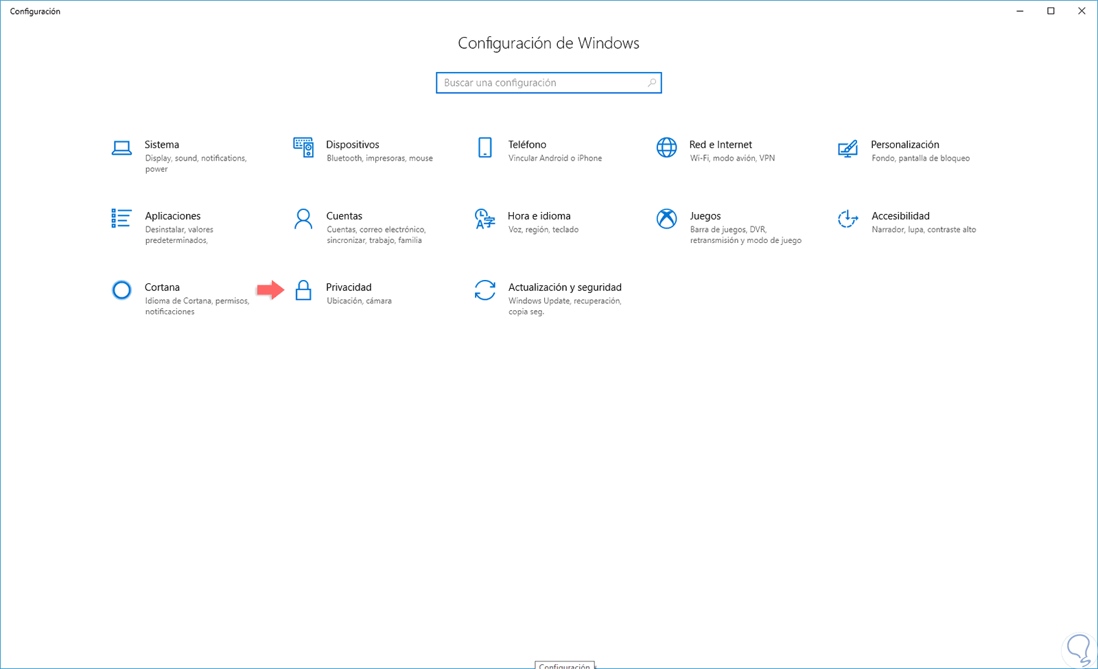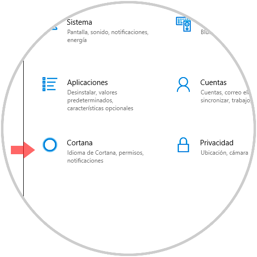 Lo primero que haremos será ir al menú de Inicio – Configuración. Una vez aaquí dentro pulsaremos en la categoría de “Cortana”.