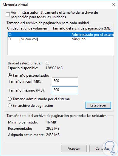 Por defecto, el sistema operativo se encarga de su administración, pero podemos activar la opción manual ya que en muchas ocasiones Windows dedica mucho espacio a esta memoria virtual afectando a los demás procesos.