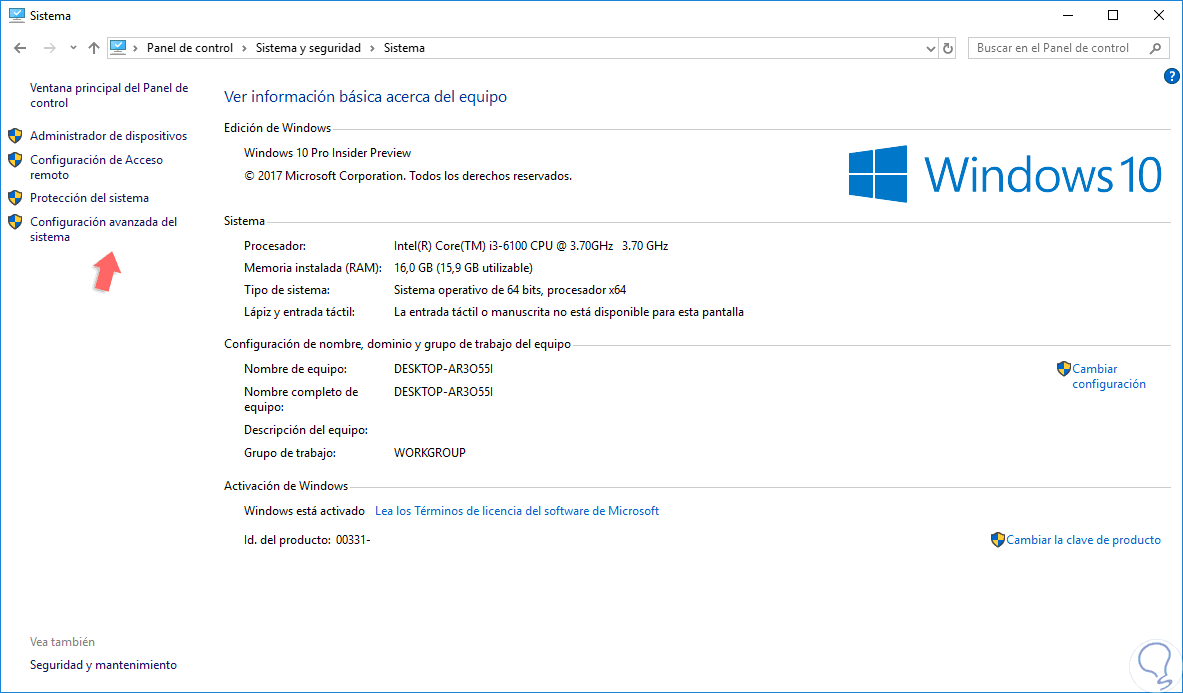 Allí pulsamos en la línea “Configuración avanzada del sistema” ubicada en el costado izquierdo y será desplegada la siguiente ventana: