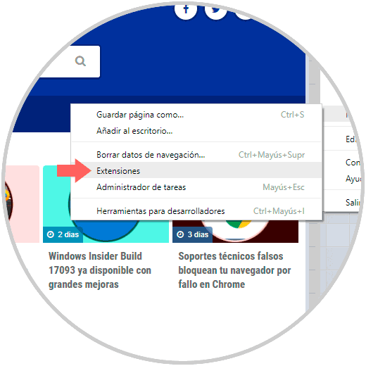 En el caso de Google Chrome iremos a la opción “Personaliza y controla Google Chrome” y vamos a la ruta “Mas herramientas / Extensiones”: