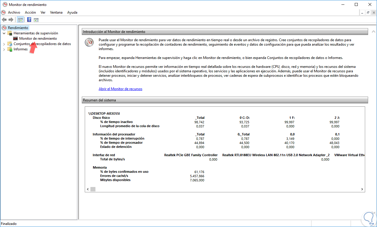 Para acceder a él, ingresamos en el cuadro de búsqueda de Windows 10 el término monitor y seleccionamos la opción “Monitor de rendimiento” y será desplegado lo siguiente.