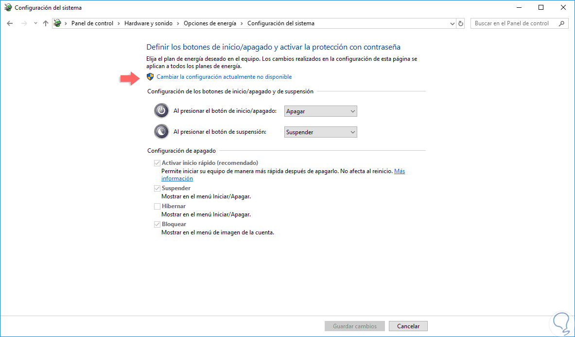 Allí damos clic en la línea “Cambiar la configuración actualmente no disponible” y podremos activar la casilla “Inicio rápido” ubicada en la parte inferior si aún no lo está.