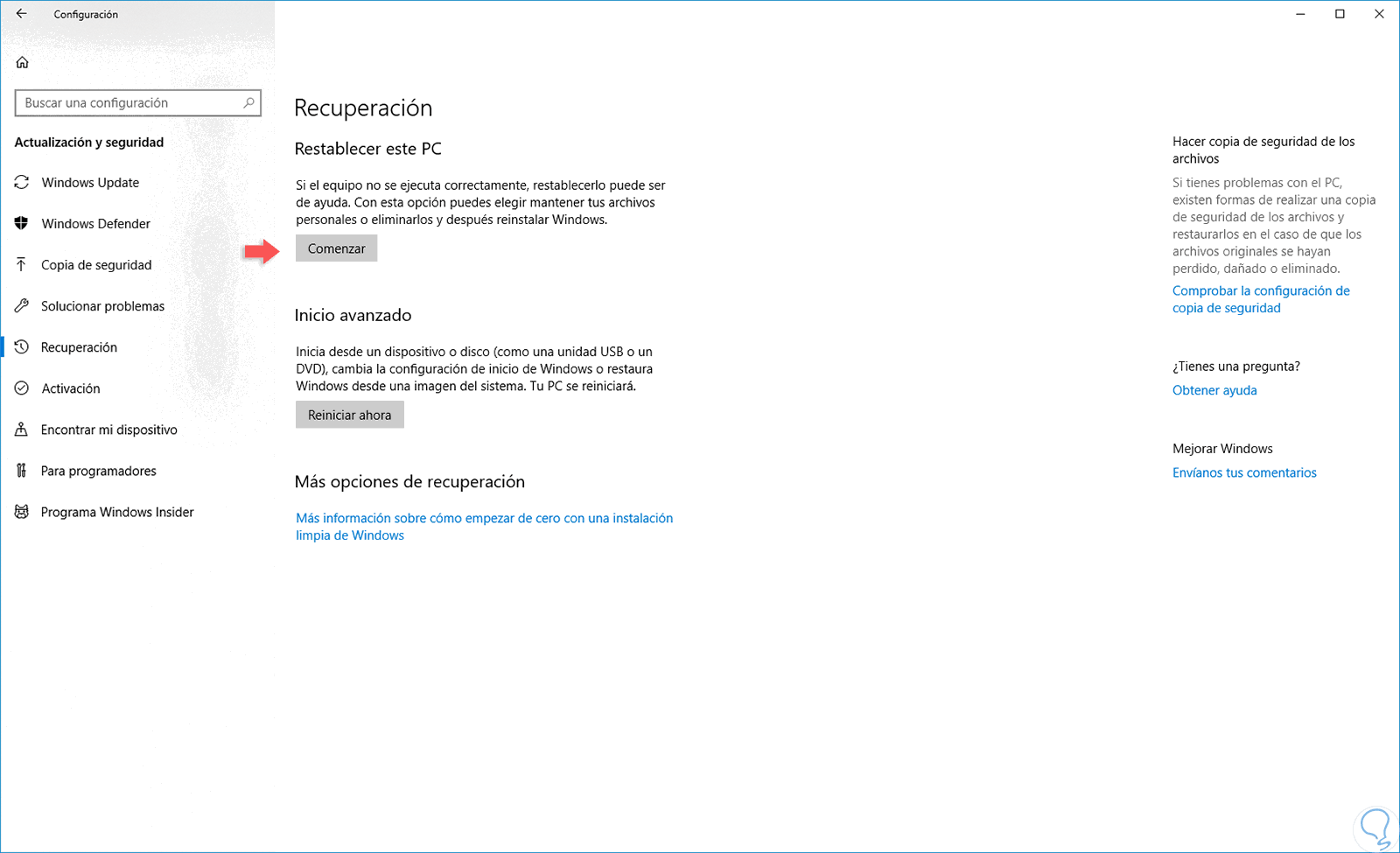 Si ninguna de las opciones anteriores no nos da una solución ideal para optimizar el equipo, finalmente podemos restablecer el equipo, método con el cual se reinstala el sistema operativo y podremos definir si conservamos o no los archivos.