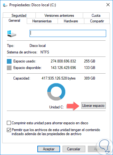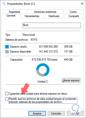 Aquí desmarcaremos la opción de “Permitir que los archivos de esta unidad tengan el contiedo indizado”.