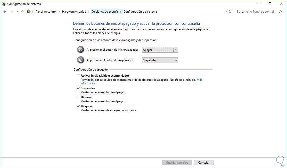 Allí pulsamos en la línea “Elegir el comportamiento de los botones de inicio/apagado” y seremos redireccionados a la siguiente ventana. Allí podremos activar la casilla “Hibernar” y pulsar en el botón Guardar cambios.