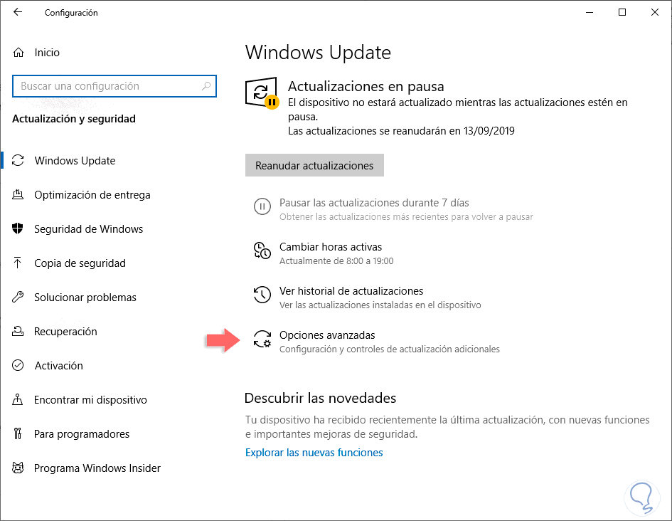 Ahora pulsaremos sobre la opción de “Opciones avanzadas” dentro del apartado de “Windows Update”.
