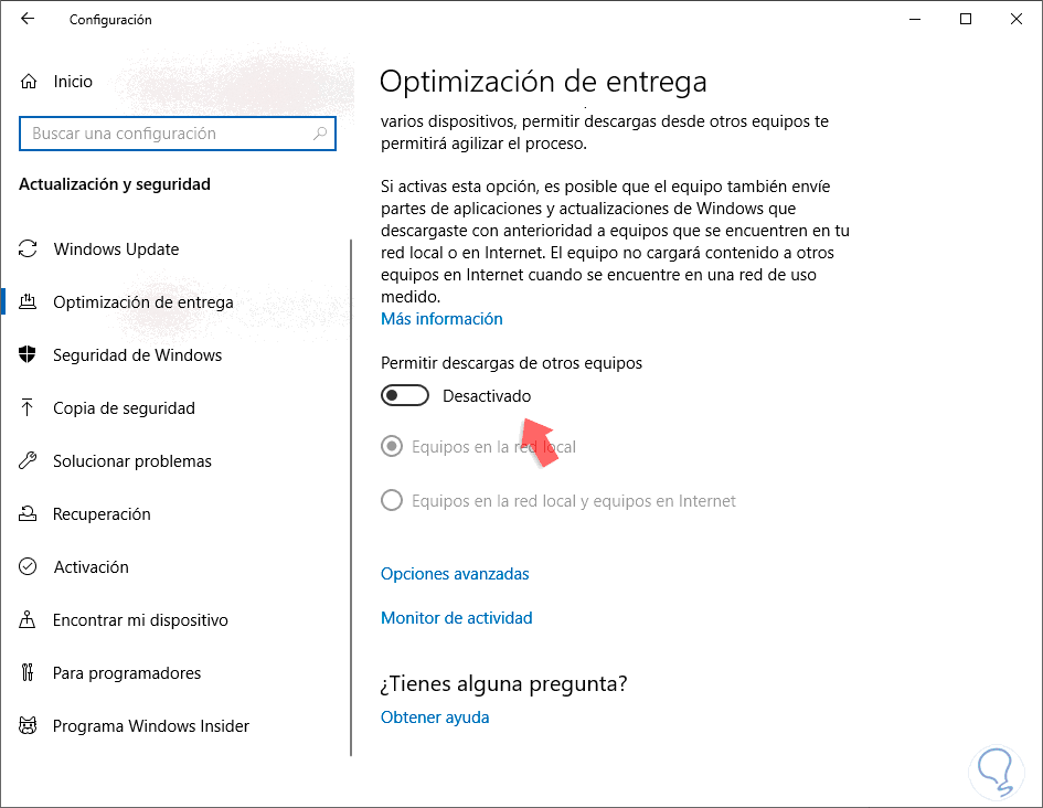 En esta ventana verifica que tienes deshabilitada la opción de “Permitir descargas de otros equipos”.