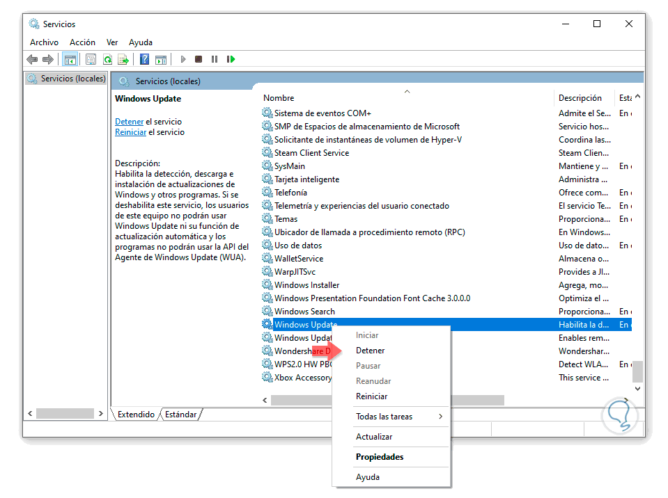 Ahora buscaremos el proceso de Windows Update y hacemos clic derecho sobre él.
