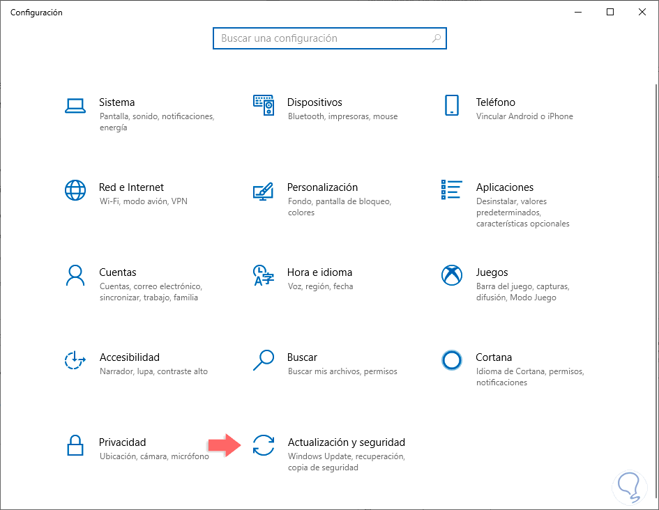 El primer paso será ir a Inicio – Configuración. Una vez dentro de aquí entraremos en la opción de “Actualización y seguridad”.