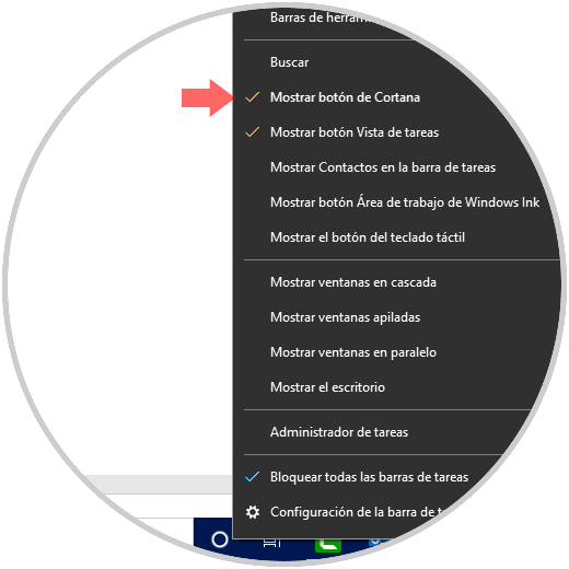 Si además no queremos que aparezca en nuestra barra de tareas iremos al icono de Cortana en la arte inferior, hacemos clic derecho sobre el asistente y desactivamos que se pueda ver.