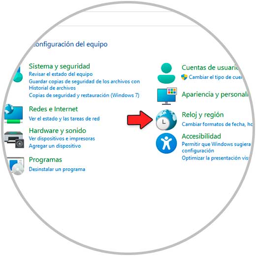 Veremos las siguientes opciones. Damos clic en "Reloj y región