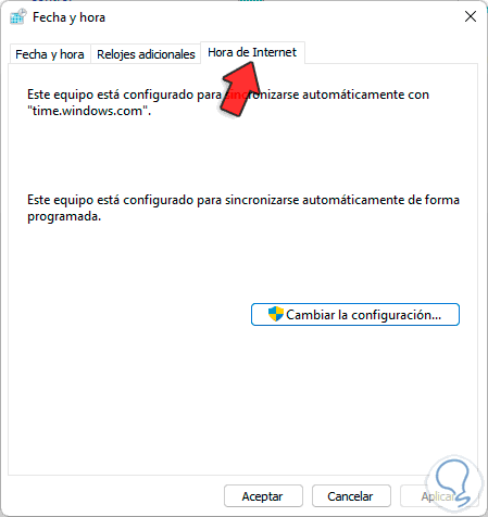 Vemos que el valor predeterminado es el tiempo de Windows, allí en el campo "Servidor" seleccionamos "time.nist.gov":