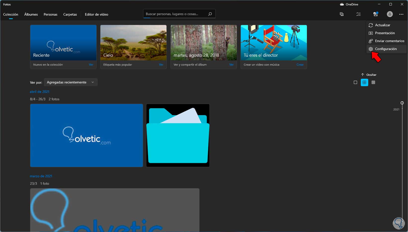 En la aplicación Fotos, damos clic en el menú superior y seleccionamos la opción "Configuración":