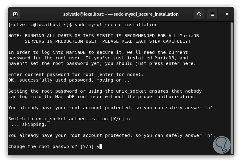 Confirmamos el cambio de contraseña de root y asignamos la contraseña deseada: