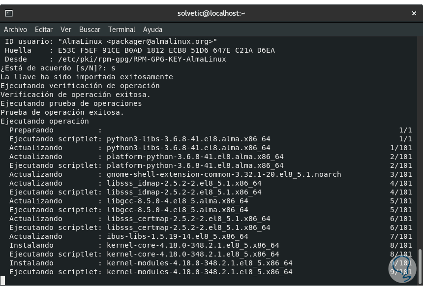 Ingresamos la letra “s” para confirmar la descarga e instalación de estas actualizaciones en AlmaLinux: