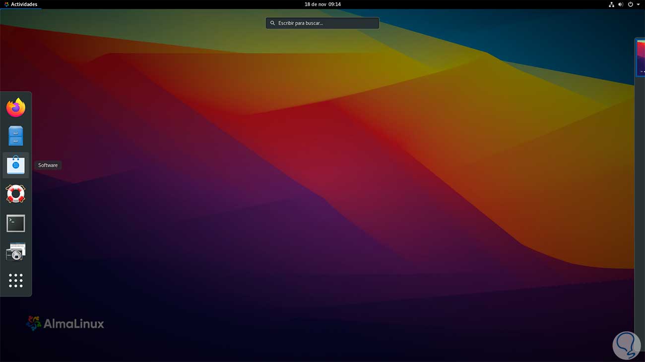 Esta es otra de las opciones disponibles para mantener AlmaLinux actualizado, en este caso en "Actividades" damos clic en "Software":