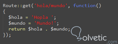 Esto lo debemos escribir en el archivo routes.php, como vemos en este caso hemos colocado un par de variables y luego hemos retornado su concatenación, esto es solo una muestra de lo que podemos lograr. Notamos también que utilizamos los métodos HTTP para poder acceder a la acción necesaria, por ejemplo si accediéramos a esta ruta desde el método POST de HTTP la acción que vemos en el código no se ejecutaría.