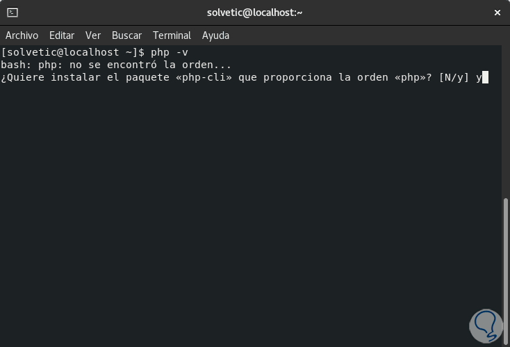 Al no encontrarse la orden PHP, podemos ingresar la letra “y” para instalar la utilidad, esperamos que el proceso llegue a su fin: