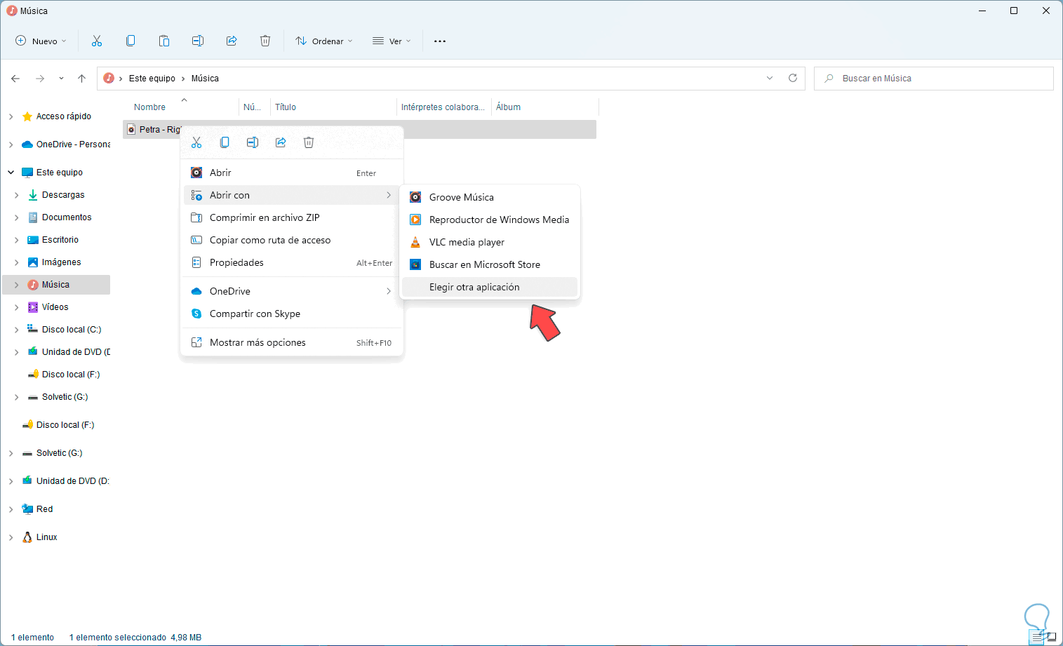Este es el primer método a ver, para este proceso abrimos el Explorador de archivos, damos clic derecho sobre el archivo de audio y seleccionamos "Abrir con - Elegir otra aplicación":