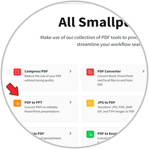 Esta es una web que nos permite realizar diferentes trabajos sobre archivos totalmente en línea y de forma gratuita, en este caso seleccionamos la opción "PDF to PPT":