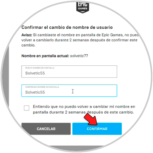 Ahora debes escribir el nuevo nombre que quieres ponerte en el juego y confirmar esta acción.