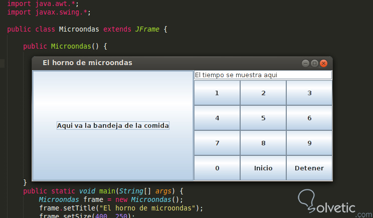Veamos el siguiente código donde construimos la disposición de un horno de microondas, tenemos el espacio de la bandeja de la comida y al lado derecho tendremos los botones que utilizaremos para operarlo: