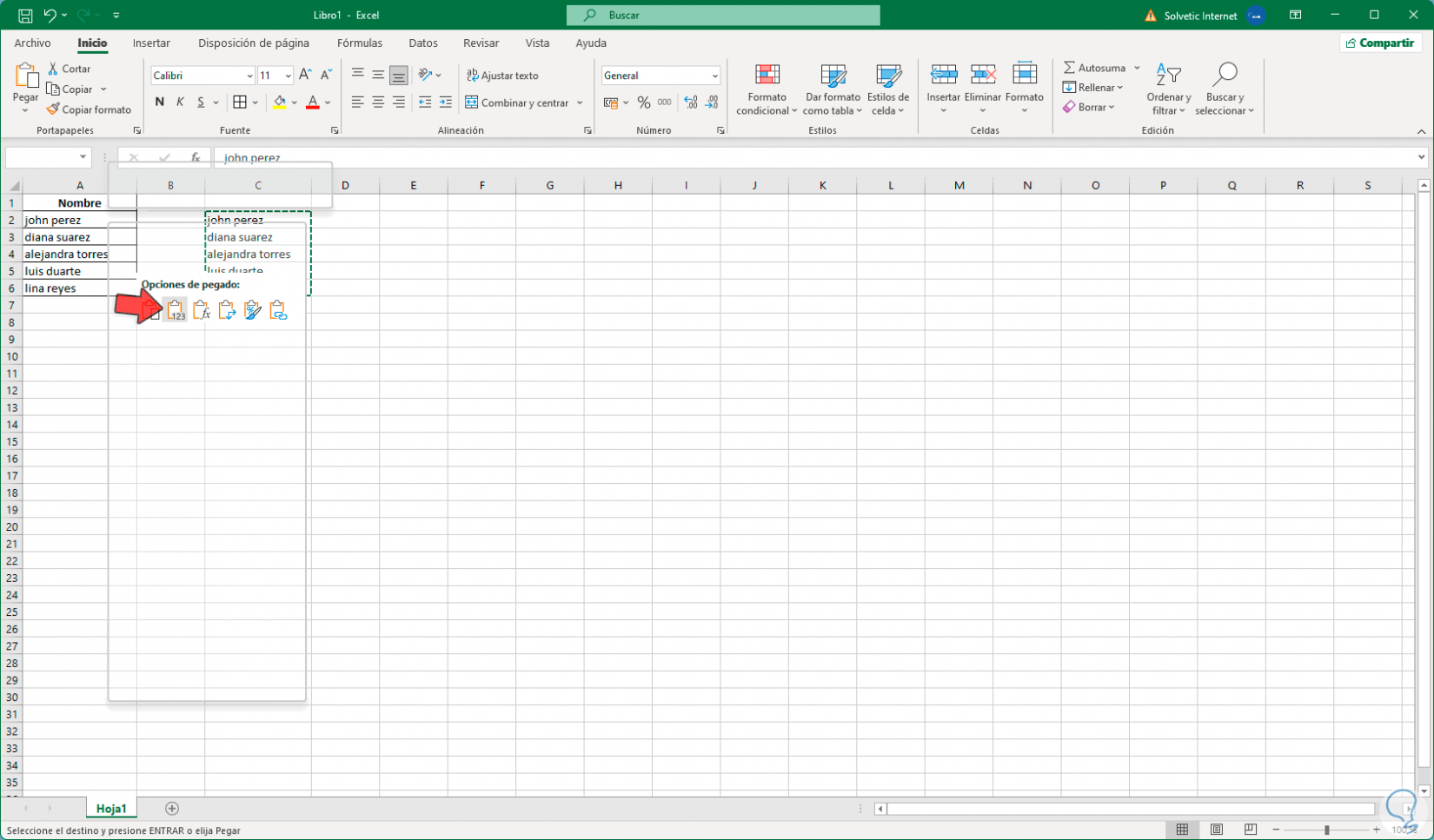 En la celda de destino damos clic derecho y seleccionamos la opción de pegar solo valores: