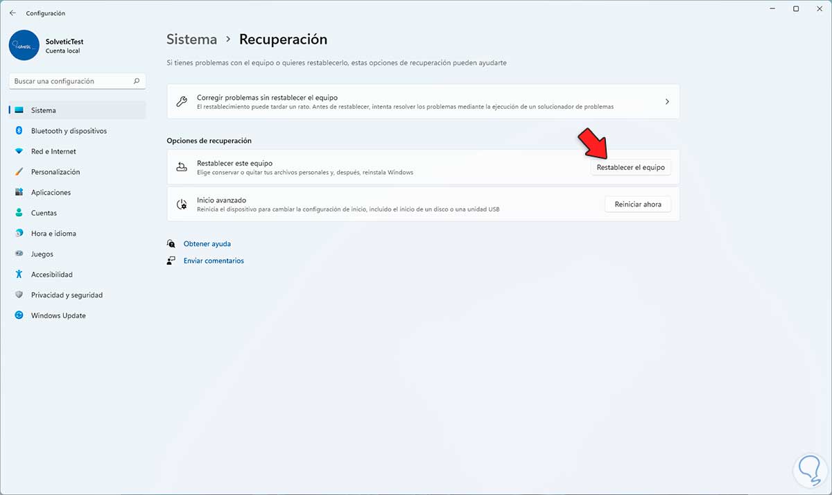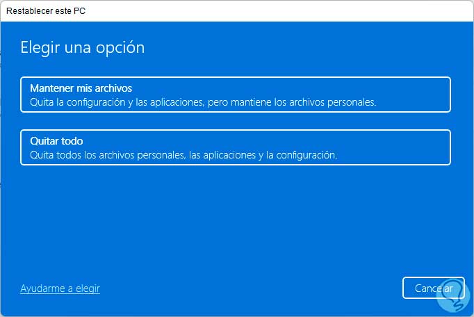 Allí seleccionamos si conservamos o no nuestros archivos, luego se definirá el tipo de reinstalación de Windows 11: