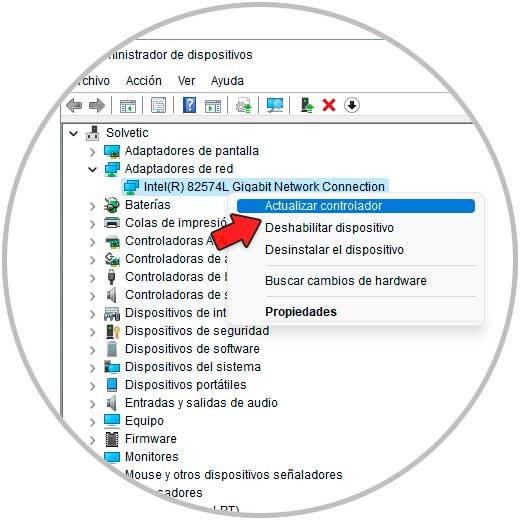 Damos clic derecho sobre el controlador con fallo y seleccionamos la opción "Actualizar controlador":