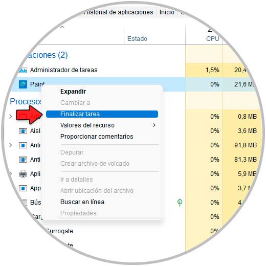 En el Administrador de tareas, damos clic derecho sobre la aplicación con error y seleccionamos la opción "Finalizar tarea":