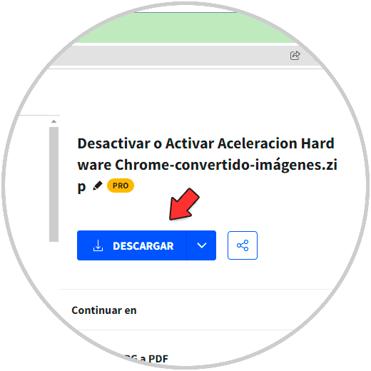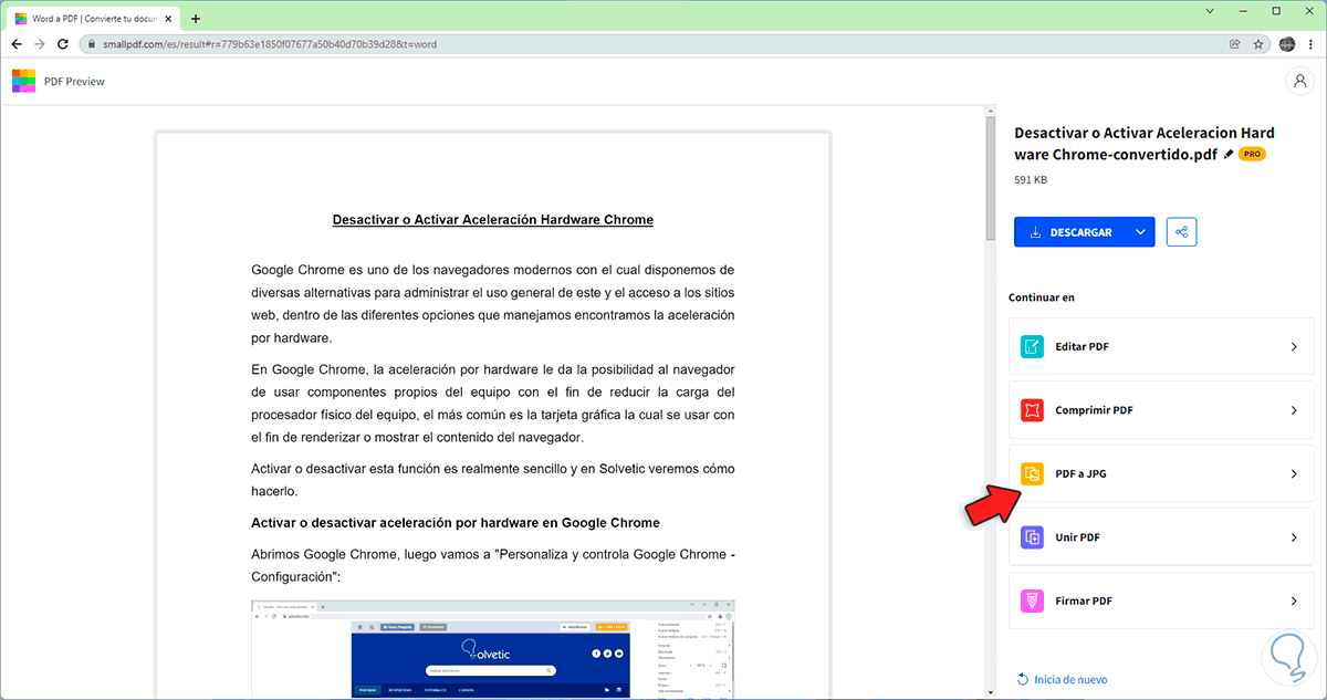 Damos clic en Abrir y se hará la conversión a PDF inmediatamente. Allí damos clic en la opción "PDF a JPG", veremos lo siguiente: