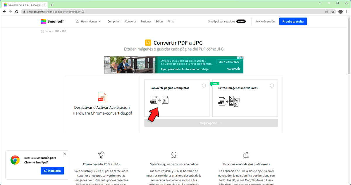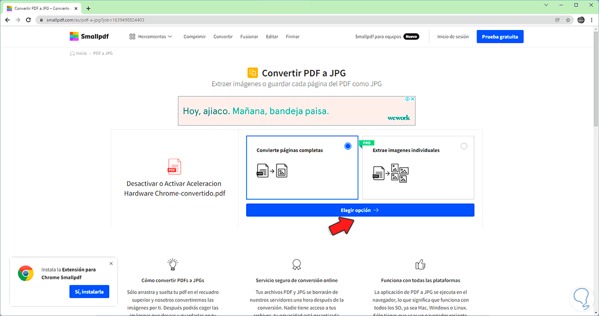Damos clic en “Elegir opción” para iniciar la conversión a JPG: